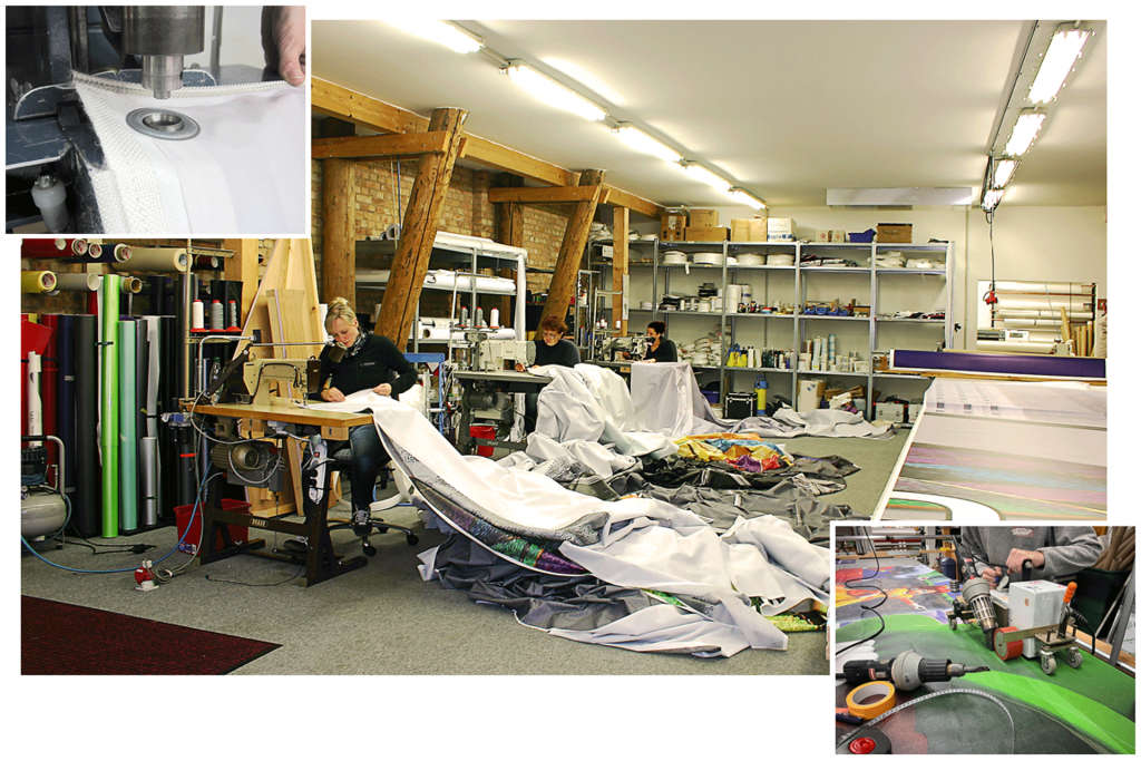 all unsere Druckerzeugnisse in einer eigenen Näherei/Sattlerei, so haben wir einen direkten Einfluss auf die Art der Konfektionierung und können für individuelle Werbung auch gleich die passende Weiterverarbeitung bieten. Egal ob vernäht, geschweißt oder mit Ösen, jede Systemkonfektionierung ist möglich auch in unterschiedlichen Kombinationen.